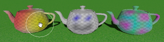 If the materials don't use one of our Oxygen-Dirt shaders, it will automatically begin in Color Mode. This will allow you to do standard vertex color painting, and will work with any shaders that make use of vertex colors. You can also paint into the alpha channel. Below is an example where all teapots share the same material, with a simple vertex-color multiply in the shader.